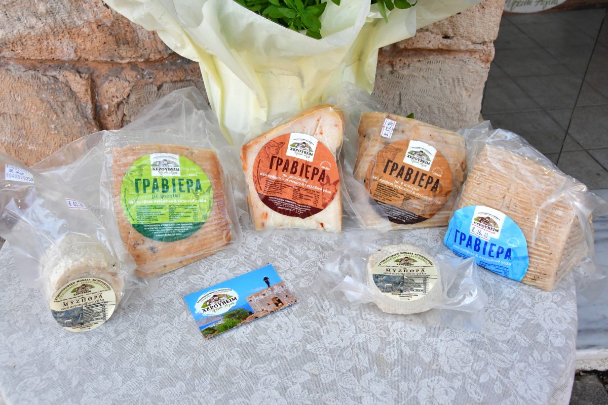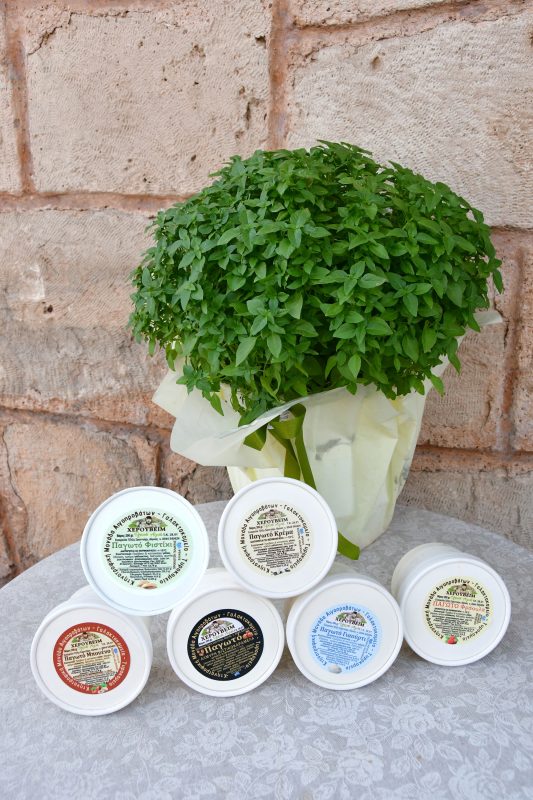 Inside, you’ll discover a wide selection of dairy products made with fresh milk from the farm: graviera cheese (plain, with pistachio, or four peppercorn), spicy feta with boukovo (red chili flakes), spefalaro with mint, creamy yogurts, artisanal butter, and traditional handmade pasta.