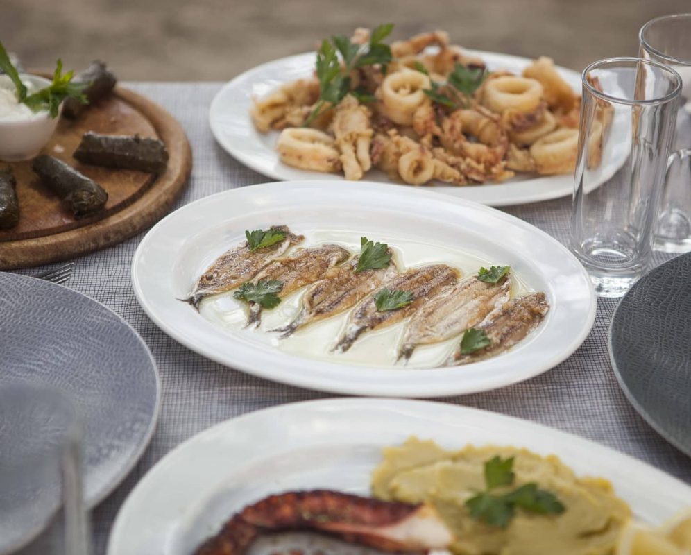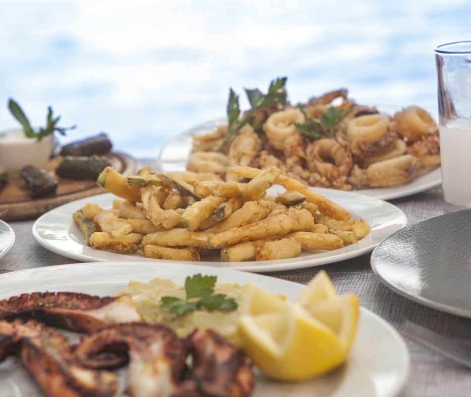 Ostria Restaurant’s must-try appetizers are its famous fava, which has been praised more than any other, the eggplant salad, which hides all its magic in the seven-sealed secret of a mystery recipe, the fried zucchini, cut from the family gardens and fried in pure oil, the family’s crispy and salty french fries, the greens, picked the same morning from the garden, the many handmade pies, and the geremezi, the traditional local cheese, made with the grandmother’s recipe by the family goats. If you have an appetite for cooked food, here you will enjoy from stuffed vegetables with delicious rice to everyone’s favorite soutzoukakia, lamb with baked potatoes and shrimp barley. At Ostria you will enjoy the all time classic Greek summer flavors, such as the grilled or boiled salad octopus, fresh fish from the nets of local fishermen – definitely try katsoules, the local fish – and fried squid, alternating them with ouzo, beer or wine from Greek producers.