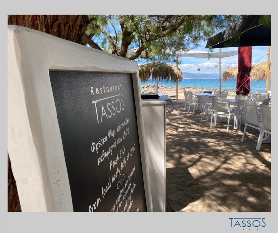 Come at Tassos Tavern from morning to night to enjoy your coffee in the special area with sunbeds on the beach, or have a drink from the outdoor bar just before you swim in the waters.