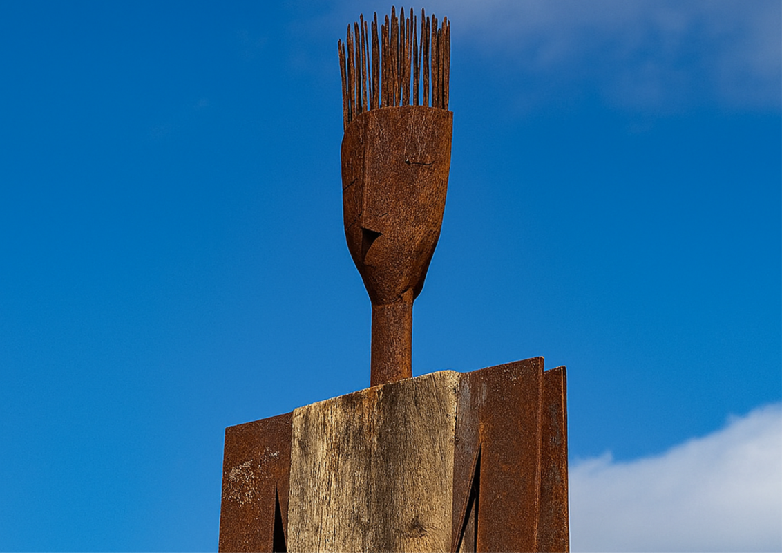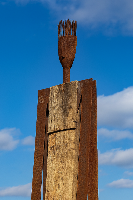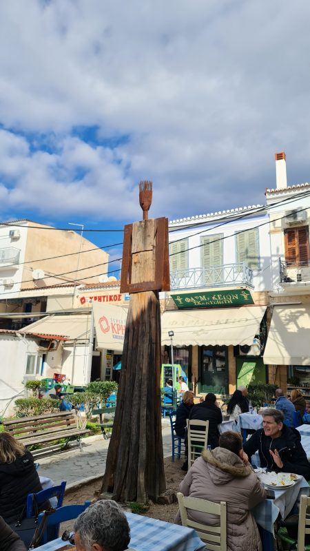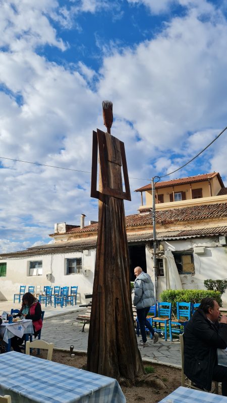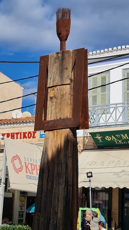 The sculpture is located in the garden of the fish market and is made of metal and a pine log, which has been on the site for many years. The trunk was rooted in the earth but it was dry and the artist worked on it and created the sculpture. Its presence in the public space of Aegina puts its own stone in the upgrading of the island.