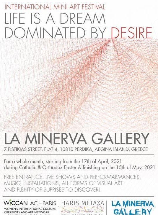 The DESIRE IN / FOR AEGINA International ART Project is expected to take place between April 15 and May 15, 2021, pandemic permettendo, throughout the island, with the participation of artists from around the world. Organized by WICCAN AC Paris, the Festival aims to open bridges of communication between Greece and the world based in Aegina. The events of the Festival serve art, poetry, philosophical thought, the body, and the senses, through sculpture, performances, painting, photography, poetic duels in different languages, and narrative short stories. The DESIRE IN / FOR AEGINA will also celebrate the 200 years from the 1821 Greek revolution by using it as a theme in the artists works. The Festival is organized by Haris Metaxa, Curator of the “OPEN BORDERS” Exhibition project, with Content Curators Marianna Catzaras and Lizzy Koster. It is dedicated to the memory of the composer and musician Martina Cisek, Vienna 1959-2020.